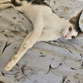 Idade: 1 ano e 6 meses Sexo: Macho FIV: Negativo Felv: Negativo Castração: Sim Cor: Branco com manchinhas rajadas